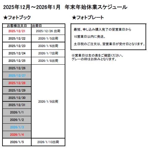 期間中の商品発送、お問い合わせにつきましては、2026年1月5日(月)から随時ご対応させていただきます。 なお、休業期間中もフォトブックの作成、ご注文は通常通り可能ですのでぜひご利用くださいませ。